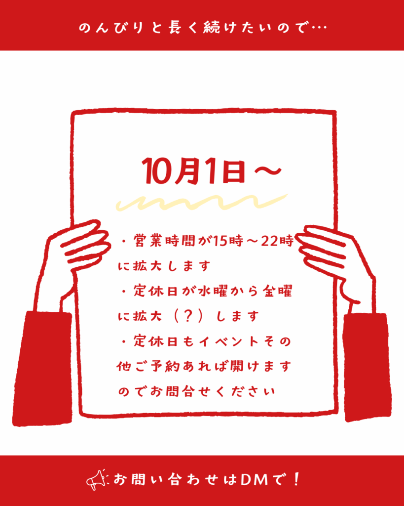 また昼呑みやカフェスペース、本を読む場所として夕方前に利用したいというお客さからの声もあったことや、私自身も元々のんびり昼からお酒を呑んだり、お茶を飲みながら本が読める場所が欲しいとお店を始めたことから営業時間は15時に戻すことといたしました。